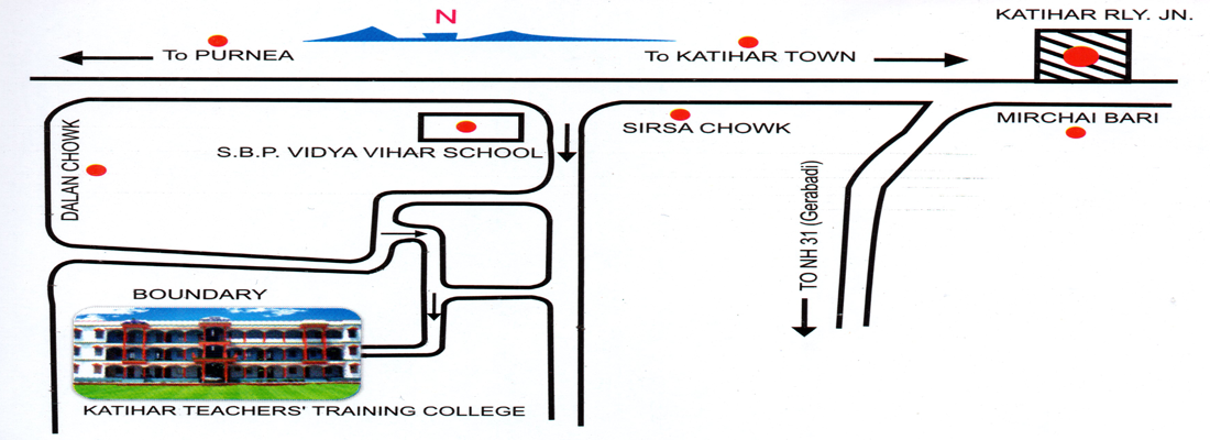 Katihar Teachers’ Training College is located six K.M. north from Katihar Railway station towards Purnea Road, Near S.B.P. Vidya Vihar School, may be reached by auto, rickshaw, taxi, bus easily.